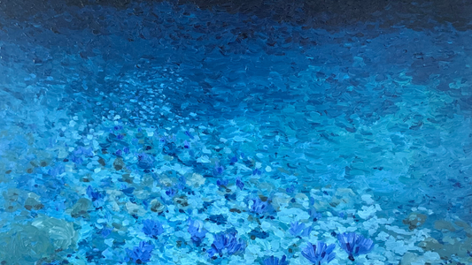 The ocean is an invitation to dive deep into ourselves. For me, it's the greatest inspiration. When I'm near it — swimming or just watching from the shore —my mind silences, allowing me to feel a profound connection to the world and to a greater consciousness. That's why the paintings in this collection are more than just landscapes; they're a meditative experience. Each canvas is a practice in letting go of control, quieting the mind, and transcending the ego.